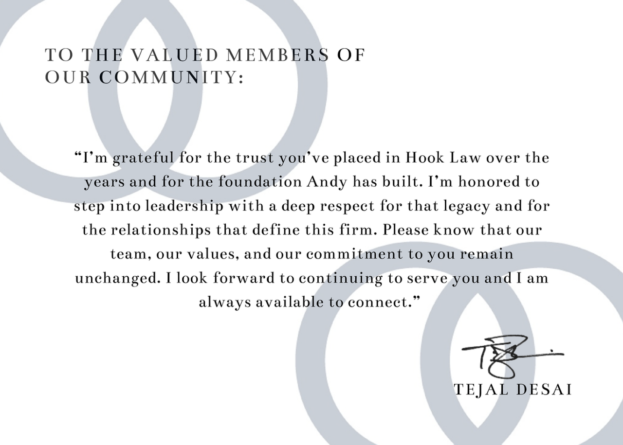 This transition is the result of years of deliberate planning and represents, in my judgment, the best possible outcome for the long-term continuity and stability of the firm. I selected Tejal because I have complete confidence in his ability to lead Hook Law forward while maintaining the standards of excellence and client service upon which the firm was built.